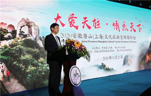 人民网上海10月21日电 今天上午,由中共潜山市委、潜山市人民政府主办的“大爱天柱 情系天下” 2020安徽潜山(上海)文化旅游宣传推介会在上海浦东新区举行。潜山市委书记张劲松、上海市文化和旅游局宣传推广处处长陈平致辞,市委副书记、市长梅耐雪推介潜山全域旅游,市委常委、天柱山风景区管委会副主任涂高生推介天柱山旅游,景域驴妈妈集团董事长、上海市安徽商会会长洪清华讲话。市领导黄银枝、郭玉晟、陈茜、余永灿、邵伟民、汪世平、林斗喜、蔡婷婷、程赟、赵伟出席推介会。