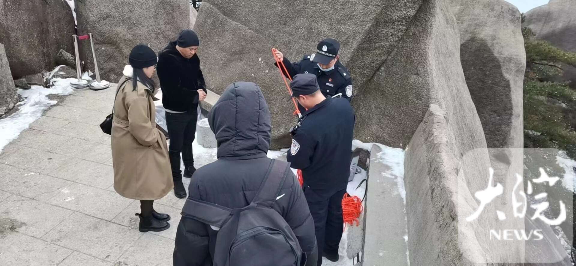 天柱山景区执法大队主峰景区中队队员葛臣第一时间赶往现场。经查看,发现悬崖陡峭,高达10米,加上那段时间正值大雪天气,悬崖结冰打滑,无法施救。吴女士又拨打110寻求帮助。接报后,茶庄派出所两名辅警到达现场,仍无法施救。经商议,吴英同意放弃施救,下山回到嘉兴。